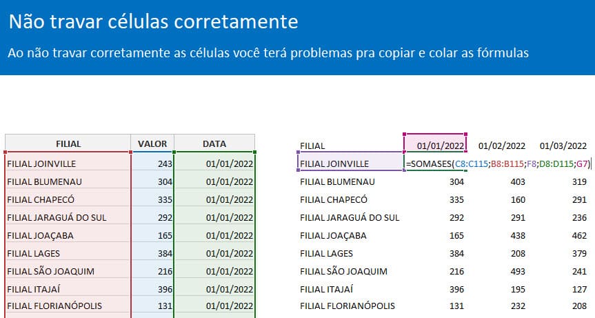 Um erro que deve ser evitado sempre é o de não travar coluna ou linha ao criar fórmulas.