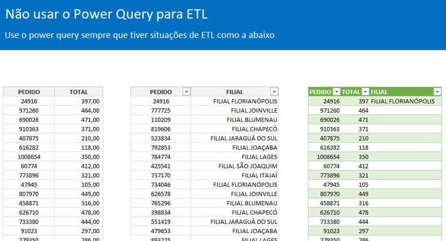 Na lista da esquerda temos os pedidos e valores, na da direita temos o pedido e a filial, e na lista verde a união entre eles que foi feita não com PROCV, mas com o Power query.