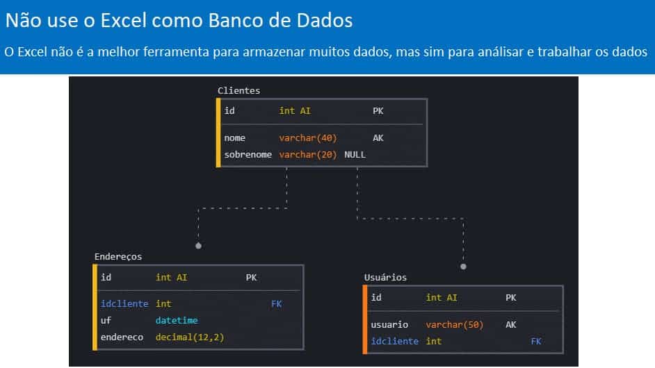 Além disso questões como relacionamentos, consultas, ficam comprometidas usando o Excel.