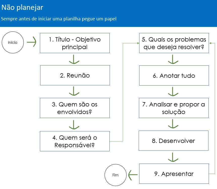 Um erro que cometemos ao criar uma solução é não planejar. Isso ocorre em vários momentos de nossas vidas e na criação de pastas de trabalho Excel não é diferente.