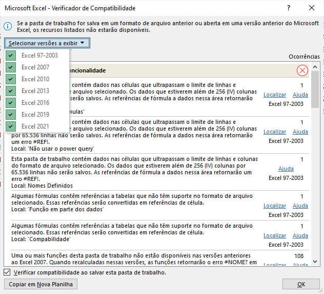 Por conta disso há no Excel o Verificador de Compatibilidade.