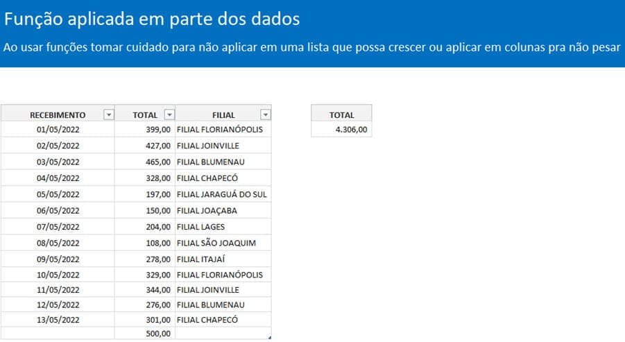 Por isso sempre que possível granule os seus dados ao máximo, lançando estas informações linha a linha para assim poder usar tabelas dinâmicas ou fórmulas de forma fácil.