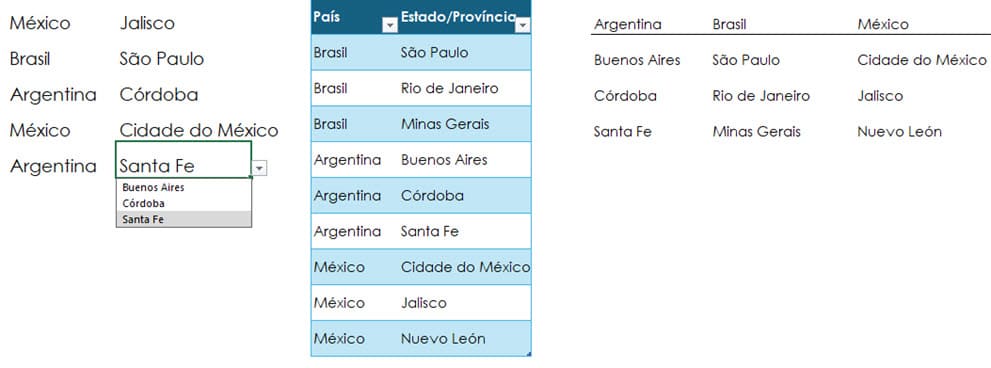 Essa fórmula usa o PROCX para buscar uma lista inteira de valores com base em um critério escolhido pelo usuário (em B5) e retorna um conjunto de dados dinâmico, que pode ser usado como fonte para validação de dados (lista suspensa).