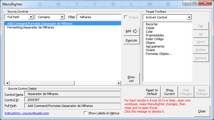 Outras características são importantes no programa, como o botão Execute, que executa a opção selecionada na lista imediatamente, ou seja, no caso da formatação milhares, ele já formata o intervalo de células selecionado com o formato de milhares, facilitando identificar se é o comando que gostaria de inserir no menu.