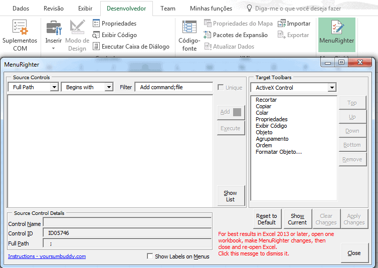 - Em Target Toolbars selecione aonde será inserido o seu menu, como por Exemplo Cells, e clique em Add, o sistema irá inserir o comando no seu menu de botão direito, e depois clique em Apply Changes.