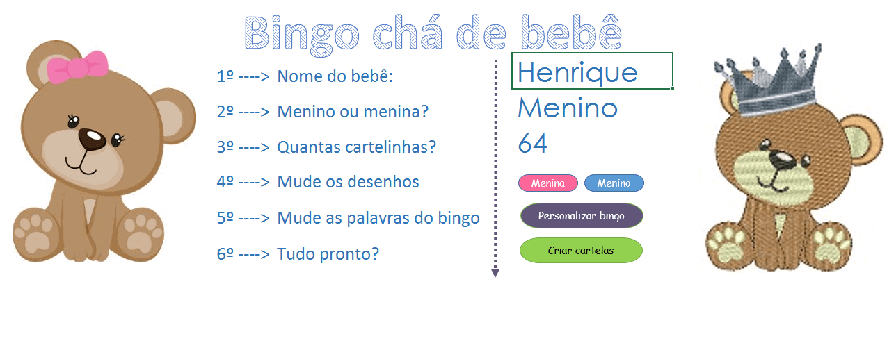 Hoje vou disponibilizar uma planilha de bingo chá de bebê. Vou ter meu primeiro filho, o Henrique =D, e a esposa pediu para ajudar ela criando o bingo do chá de bebê. Então peguei um modelo de planilha que a nossa amiga Ana Elisa disponibilizou e criei esta planilha com Excel e VBA.