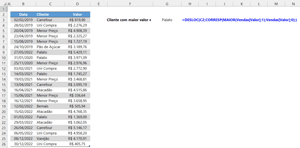 A fórmula inserida foi: =DESLOC(C2;CORRESP(MAIOR(Vendas[Valor];1);Vendas[Valor];0);). A partir do nome da coluna dos clientes, ou seja, C2, deslocamos para baixo uma certa quantidade de linhas. Esta quantidade é fornecida pelo resultado de CORRESP.