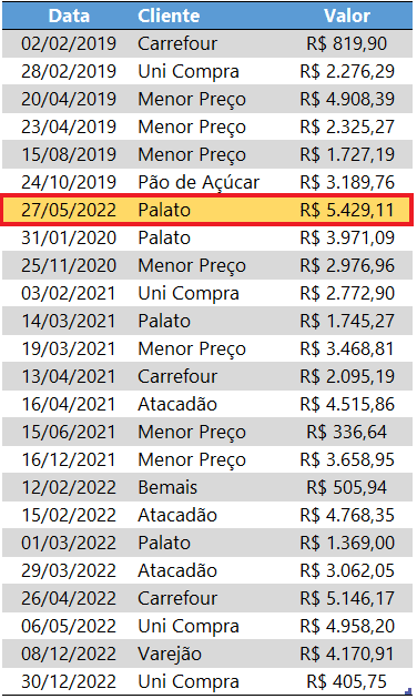 Note que a linha em destaque evidencia o maior valor dentre todos os valores: R$ 5.429,11. Com isso em vista, espera-se retornar o cliente Palato, referente a este valor.