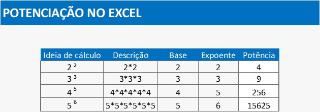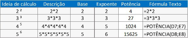 Observe a Figura 1. Note que na primeira coluna temos a ideia de cálculo estruturada, na coluna ao lado temos a descrição, ou seja, o cálculo apresentado de modo explícito. Nas colunas seguintes temos: base, expoente e o resultado denominado potência.