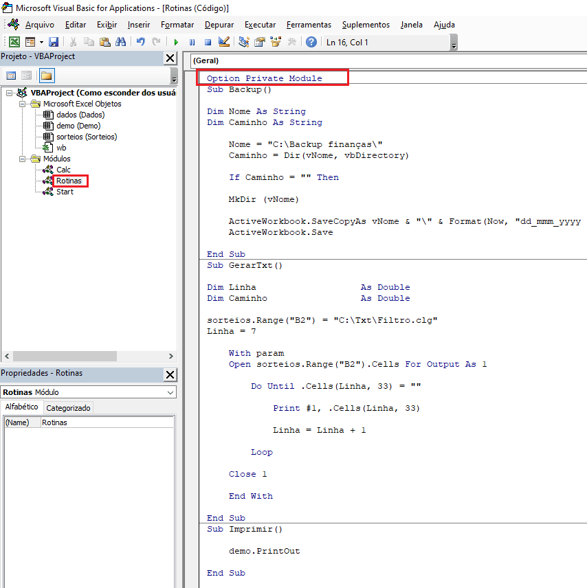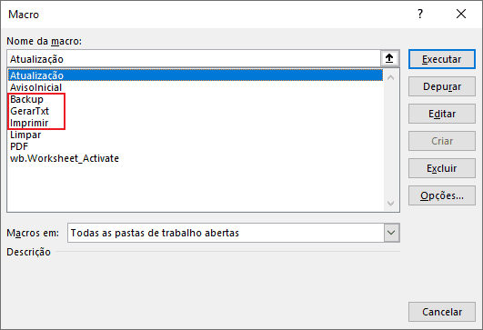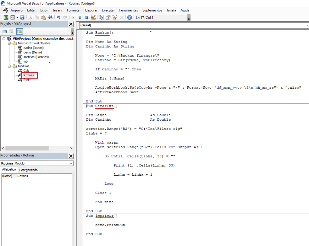 Veja a imagem seguinte o módulo Rotinas selecionado. Este módulo possui 3 macros em sua composição (Backup, GerarTxt e Imprimir).