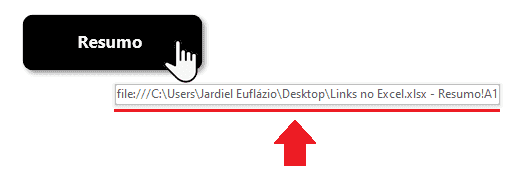 O hiperlink em questão está com um apontamento do disco C:, referenciando o usuário Jardiel Euflázio no Windows, estando o arquivo na pasta Desktop. Veja no final do apontamento que o arquivo (pasta de trabalho) está renomeado como Links no Excel, possuindo o formato xlsx (padrão). A última parte do hiperlink indica que ele faz referência à célula de endereço A1 na planilha chamada Resumo.