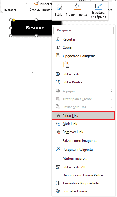 Para aplicarmos as dicas de tela basta editarmos o hiperlink. Para isso, com o objeto selecionado, podemos usar o atalho CTRL + K ou ainda clicar com o botão direito do mouse e escolher a opção Editar Link, conforme mostra a imagem a seguir.