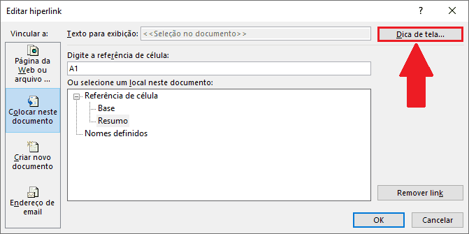 Nela podemos observar a planilha de destino (Resumo) apontada pelo hiperlink, bem como o endereço da célula (A1) que será selecionada no hiperlink.