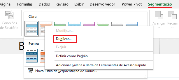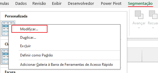 P.S: a opção de “Modificar” não se encontra disponível para segmentações de dados originais do Excel, não personalizadas.