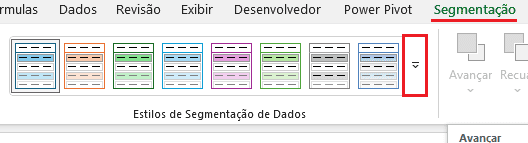 Ao selecionar uma segmentação de dados aplicada, devemos selecionar a sua guia contextual – Segmentação – e no grupo Estilos de Segmentação de Dados, encontraremos os estilos que o Excel já oferece.