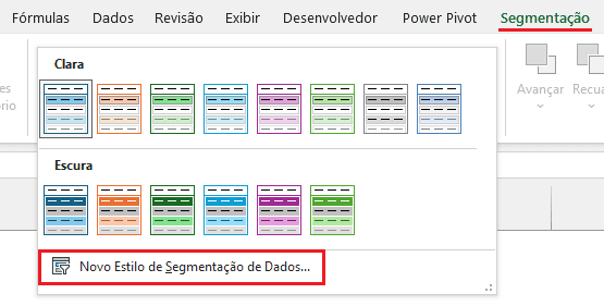 Ao selecionar uma segmentação de dados aplicada, devemos selecionar a sua guia contextual – Segmentação – e no grupo “Estilos de Segmentação de Dados”, clicamos na seta de mais opções, ao lado do último estilo visível.