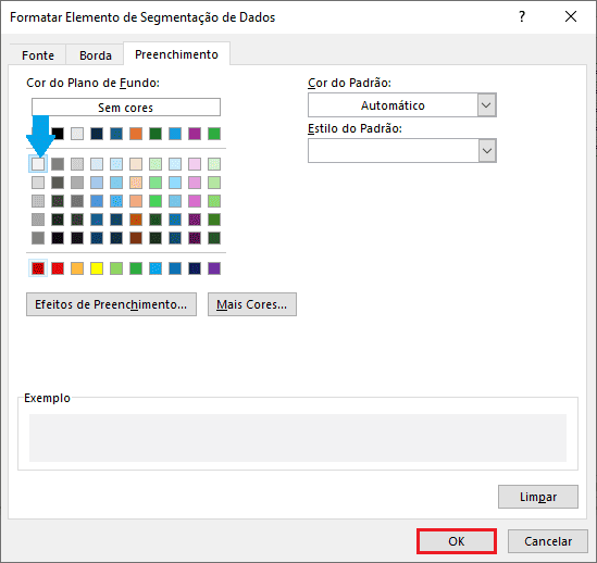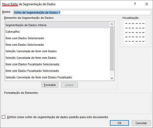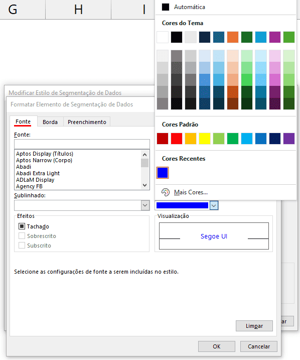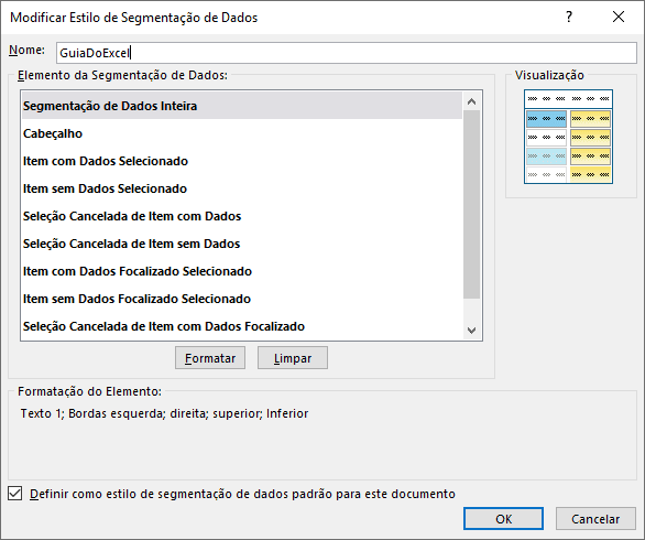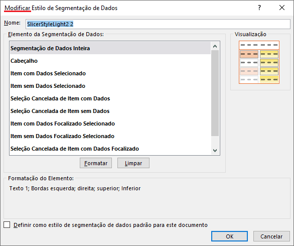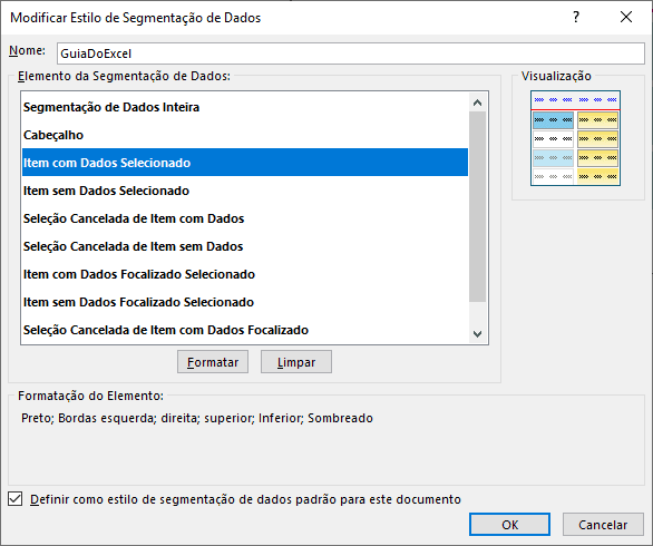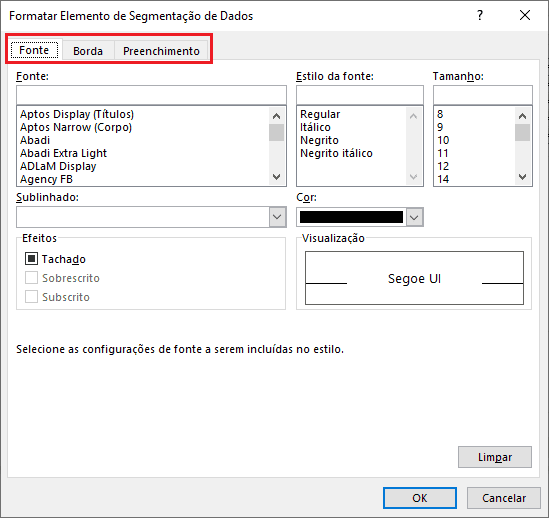 A janela apresenta os elementos da segmentação de dados que podem ser alterados. As alterações envolvem fonte, preenchimento e bordas. Podemos alterar as cores e tipos do preenchimento, fonte e bordas, fazendo boas composições.