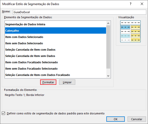 Para exemplificação, aplicaremos uma mudança no cabeçalho da segmentação de dados. Para isto selecionamos o elemento desejado e indicamos a opção “Formatar”: