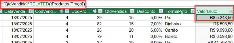 Total Linha = Vendas[Quantidade] * Vendas[PreçoUnitário]