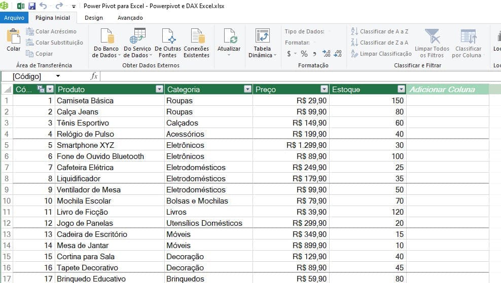 6. Como resultado você terá a tabela carregada no Power Pivot do Excel