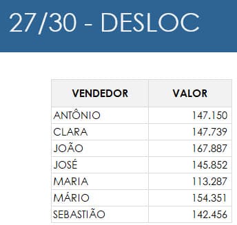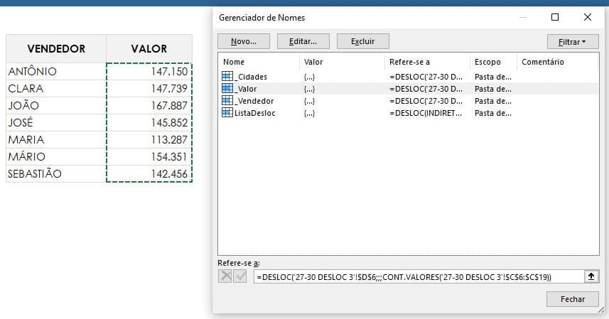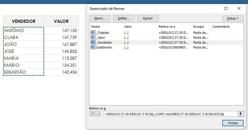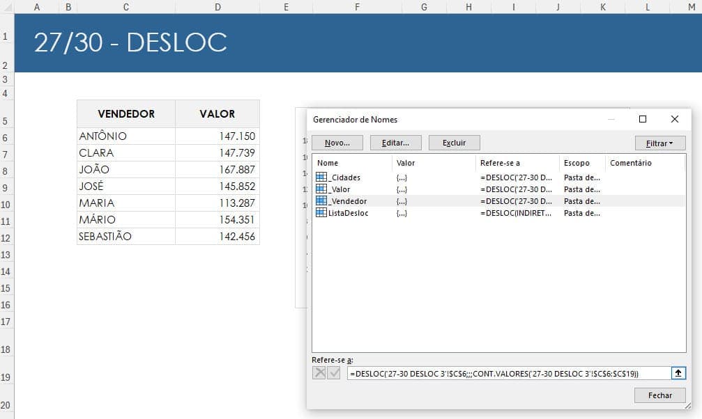 E para _Vendedor use a função: =DESLOC(’27-30 DESLOC 3′!$C$6;;;CONT.VALORES(’27-30 DESLOC 3′!$C$6:$C$19))