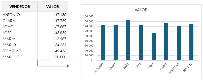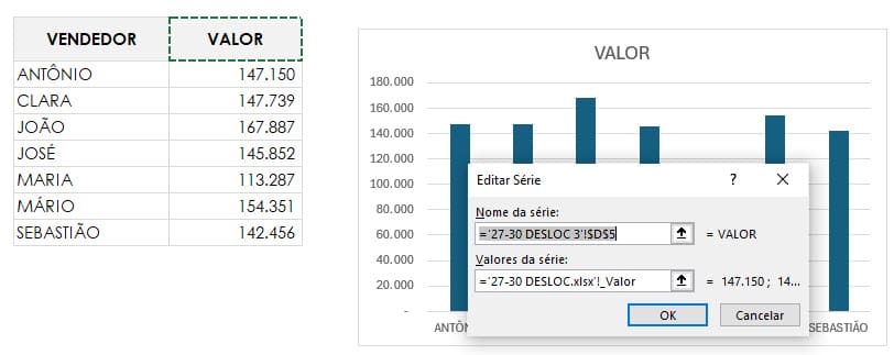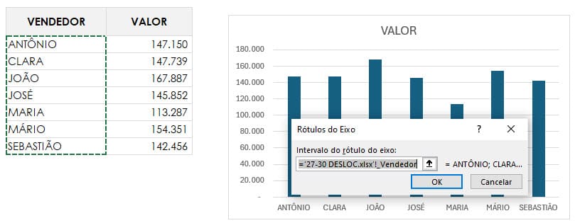 O intervalo definido _Valor se refere aos valores do gráfico e _Vendedor ao intervalo de vendedores.