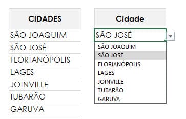 Clique em Dados->Validação de dados->Lista e digite =ListaCidades, desta forma teremos na célula uma lista que poderemos selecionar os itens da cidade.