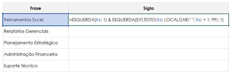 A fórmula aplicada é =ESQUERDA(B6; 1) & ESQUERDA(EXT.TEXTO(B6; LOCALIZAR(” “; B6) + 1; 99); 1)