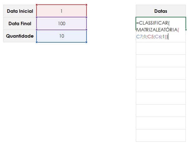 No nosso exemplo usamos a fórmula =CLASSIFICAR(MATRIZALEATÓRIA(C7;1;C5;C6;1)).