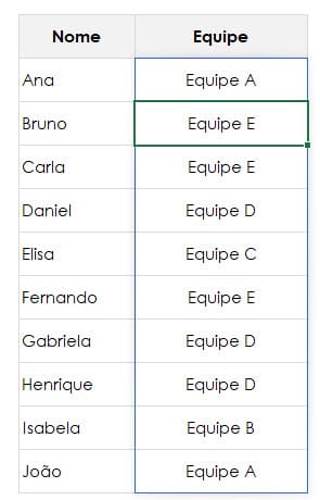 Para gerar valores aleatórios de nome de equipe usamos a fórmula =ÍNDICE($F$6:$F$10;MATRIZALEATÓRIA(10;;1;5;1)).