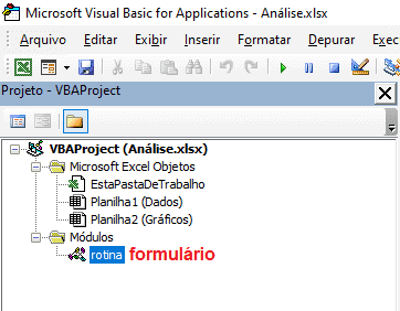 Note que a 2ª pasta de trabalho contém um módulo, nomeado com “rotina”, enquanto a 1ª pasta de trabalho não possui ainda módulo.