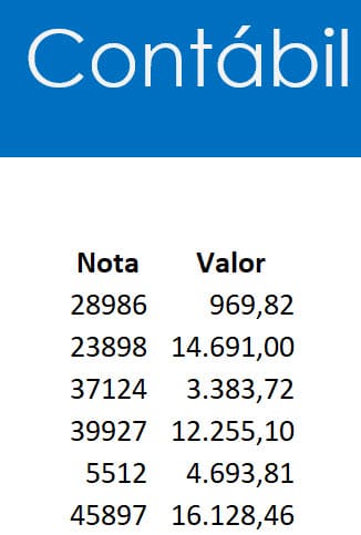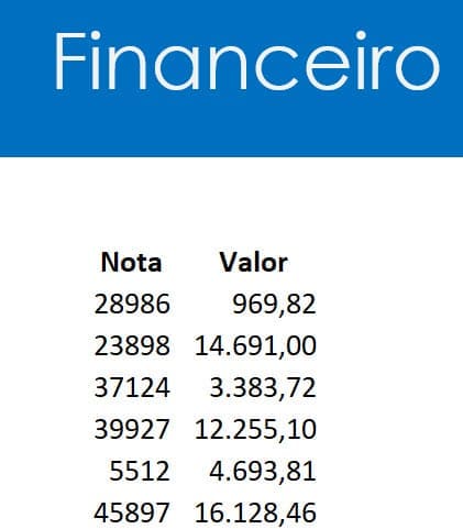 Digamos que tenhamos abaixo a lista de notas fiscais e os valores do Financeiro.