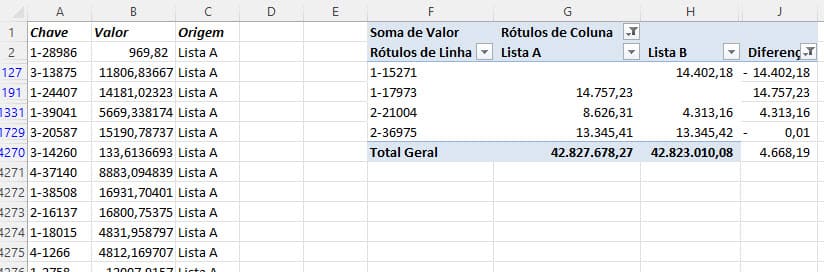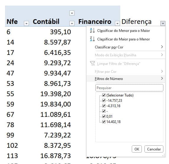 Lembrando que você deve substituir os dados pelos dados das chaves e valores que deseja comparar, não necessariamente notas fiscais ou entre o contábil e o financeiro.