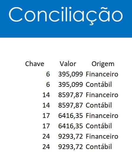 Origem ou Financeiro, no nosso caso, cada lista terá que ter o nome da origem para podermos comparar na lista de conciliação.
