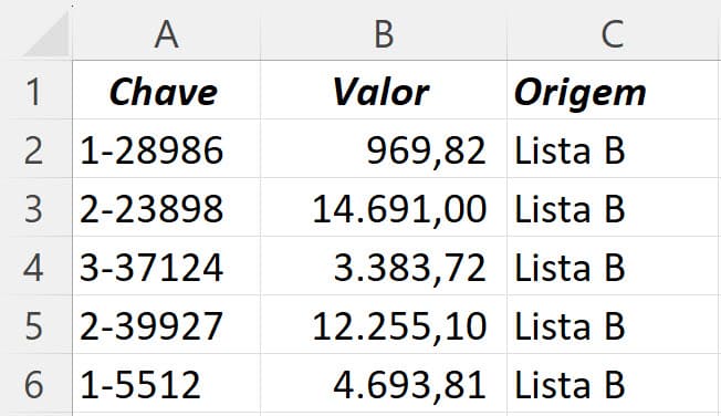 Em seguida preencha a Lista B da mesma forma com a coluna de Origem também com o nome de destino.