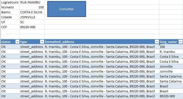 Abaixo o código VBA que cria uma consulta XML para o Google Maps, trazendo informações como o endereço completo, latitude, longitude, etc.