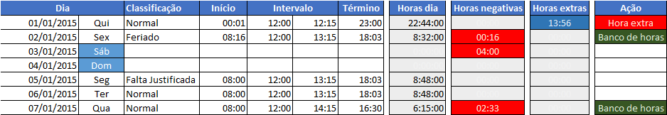 - Á partir destas simples configurações e lançamentos a planilha já realizou os cálculos das horas extras. Cabe agora classificá-las conforme o dia. Estas classificações são:
