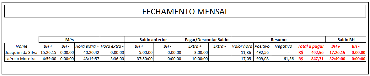 - Fechamento mensal com o total de banco de horas e o total de hora extra a pagar para cada funcionário controlado na pasta de trabalho do Excel.