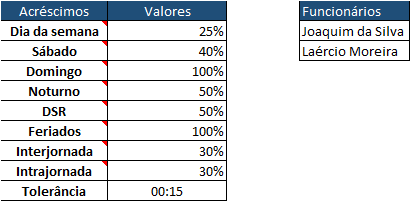 O cadastro possui as configurações gerais da empresa com relação ao banco de horas. Elas incluem os percentuais de acréscimo para horas trabalhadas fora do horário de trabalho e também uma lista simples dos funcionários que serve como base em outras planilhas da pasta de trabalho como por exemplo para a navegação.