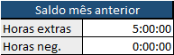 Nestas células configure o total de horas extras (horas positivas) ou horas negativas que o funcionário possui. Estas horas devem ser transportadas para a planilha do mês seguinte, levando em consideração que esta planilha serve sempre para um mês, você deve usar uma para cada mês.