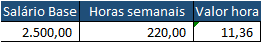 Nas células do salário base configure o salário e a quantidade de horas semanais totais do funcionário. Estes valores são utilizados como base para o cálculo do valor hora, que será utilizado para definir o valor da hora extra a ser pago.