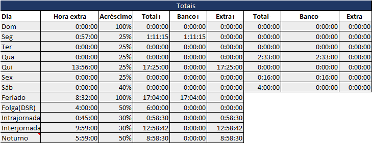 Nesta planilha você tem o total que deverá ser passado ao departamento de RH para o pagamento de horas extras e de banco de horas.