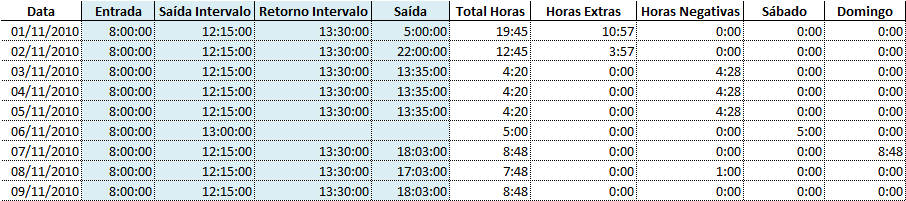 Esta planilha possui cálculo das horas extras, horas negativas, e horas trabalhadas em sábados e domingos.