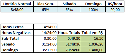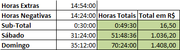 - Horas extras: Soma da coluna de horas extras da planilha, somente as horas extras de segunda a sexta estão nesta coluna;