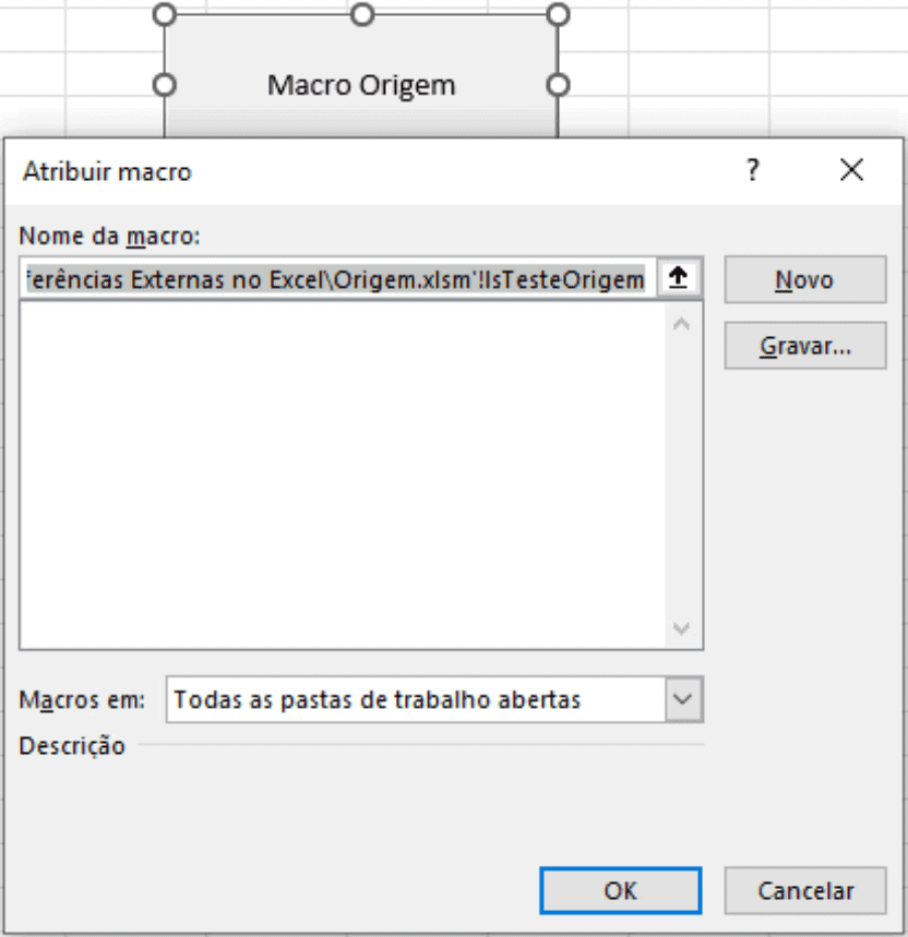 Veja que ao clicar em atribuir macro, identificamos o caminho para uma macro externa.
