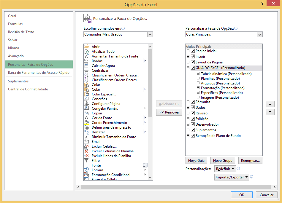 2. Clique na opção Personalizar Faixa de Opções, esta opção permite incluir funcionalidades que não estão ativas por padrão no Excel. O formulário é uma delas;