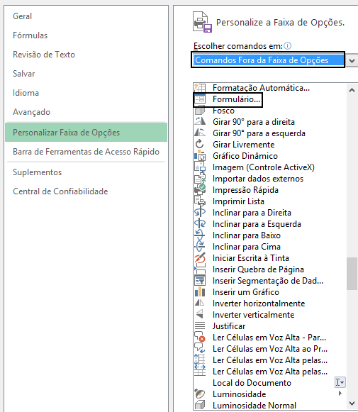 5. Na lista de opções da Esquerda selecione a opção Comandos Fora da Faixa de Opções e adicione o comando Formulário ao seu grupo criado á direita clicando no botão Adicionar;