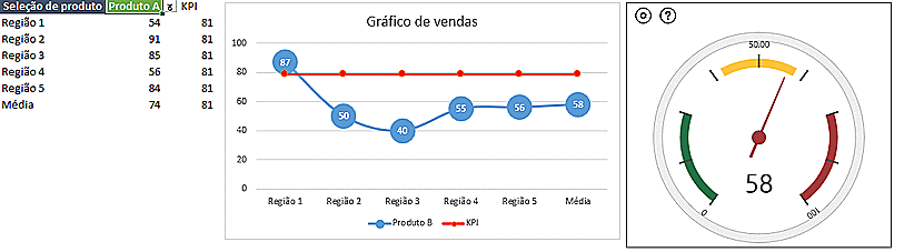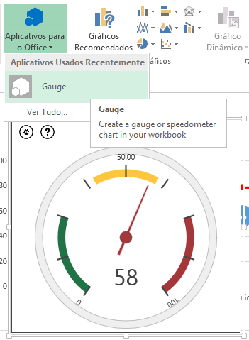 Hoje criei rapidamente um indicador de desempenho que encontrei na internet, e achei interessante por utilizar a novidade do Excel 2013, Aplicativos para o Office incluindo um modelo de Gauge, o chamado velocímetro automaticamente na sua planilha. Veja aqui como ela foi inserida https://www.youtube.com/watch?v=odmZm9JF2aw.