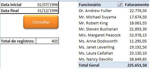 Passo 12: Você pode alterar o código fonte para passar os parâmetros que quiser, como no exemplo da planilha aonde são passadas as datas nas células da aba de configuração, e ao clicar no botão Consultar é chamada a stored procedure que passa os parâmetros alterando a consulta e atualizando os dados.