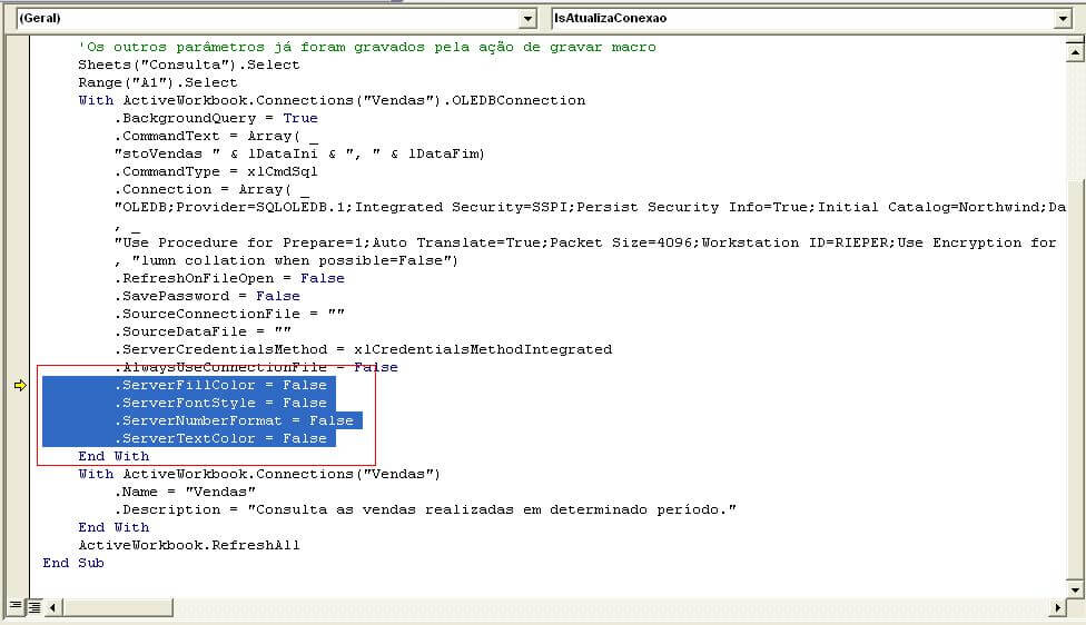 With ActiveWorkbook.Connections("Vendas").OLEDBConnection